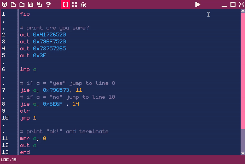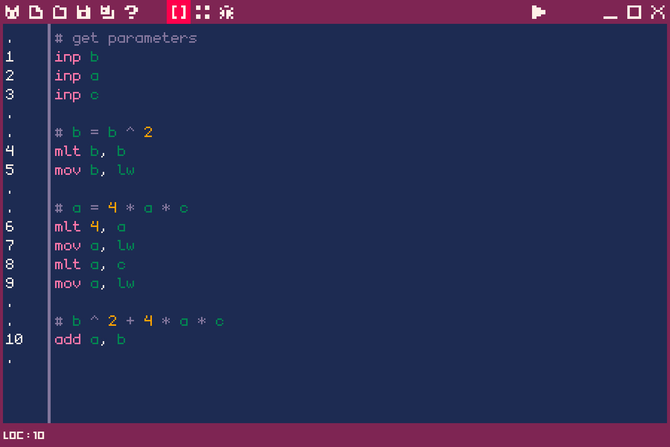 Chip-13 (Chippie) is a light-weigh, not very well optimized emulator of a fantasy computer (for windows) which allows you to run assembly code!